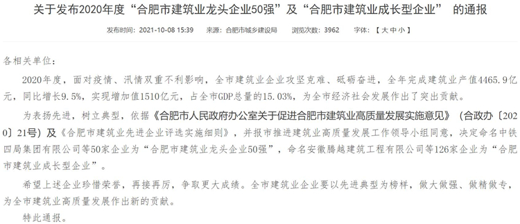 近日,從合肥市城鄉建設局傳來喜訊,公司喜獲2020年度“合肥市建筑業龍頭企業50強”榮譽稱號,位列前三甲。