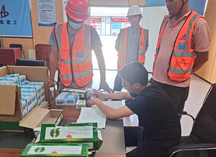 近日,七公司組織在合肥一中東校區和御景黃城兩個在肥項目開展“送清涼”活動。發放的防暑降溫物品包括人丹、十滴水、清涼油及藿香正氣口服液等,合肥一中東校區項目每天還為班組工人發放兩次雪糕冷飲。