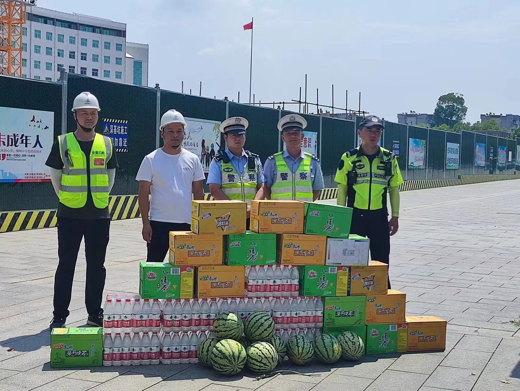 自開工以來,項目的順利推進離不開廬江縣交警中隊的大力支持。為了表達對交警同志們的感激之情,7月15日上午,水利交通公司廬江縣廬城鎮1#、2#、3#片區雨污分流改造及管網修復項目管理人員購買了送清涼物資2車,包括礦泉水、綠茶、西瓜等,讓堅守在一線的交警們感受到“警民一家親”的溫馨。