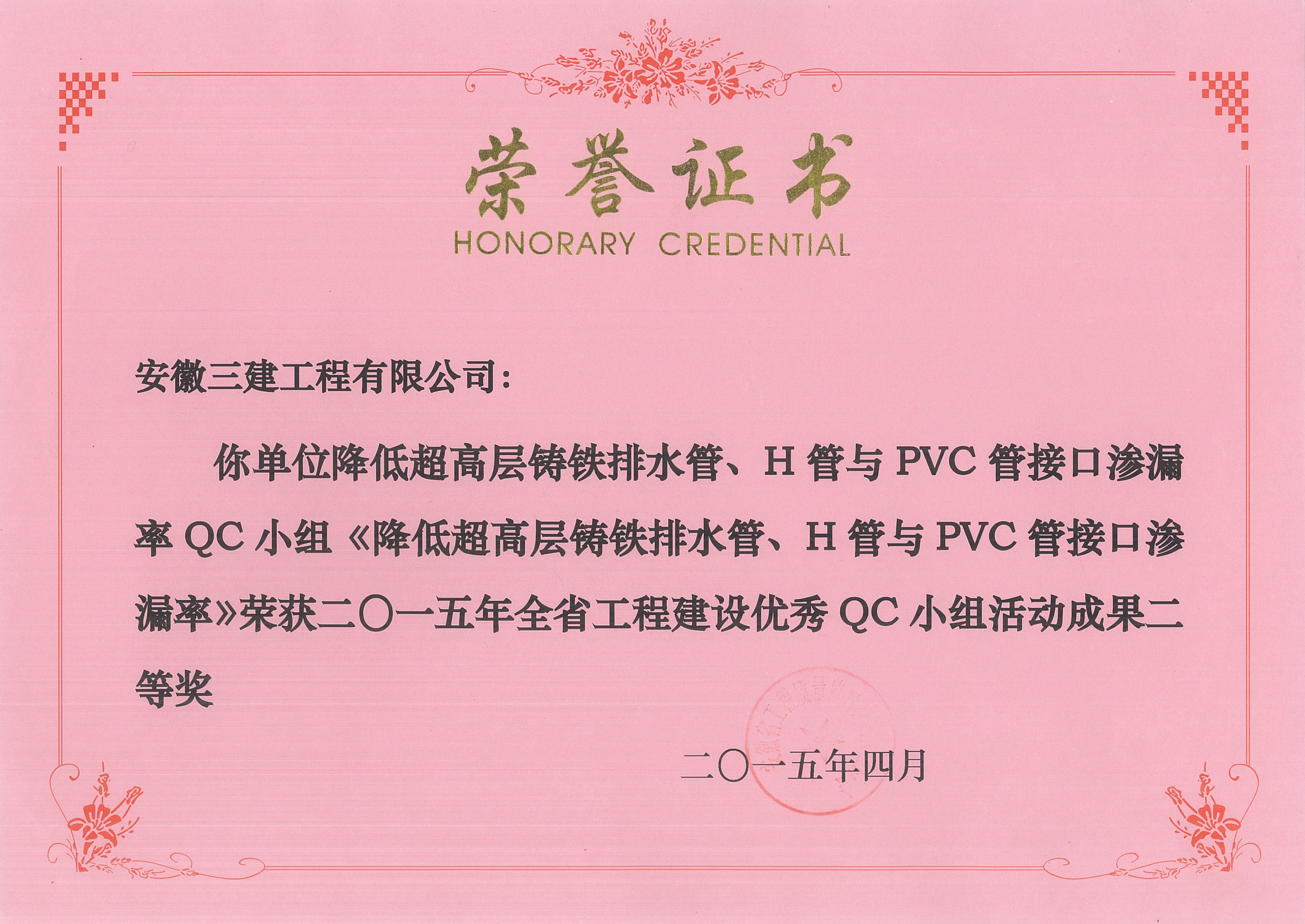 2015年全省工程建設(shè)優(yōu)秀QC小組活動(dòng)成果二等獎(jiǎng)