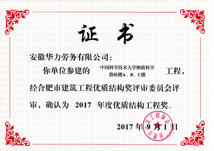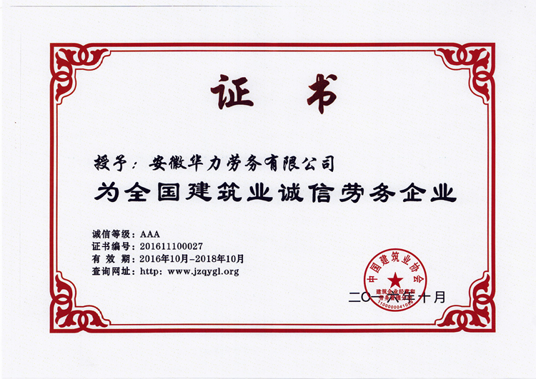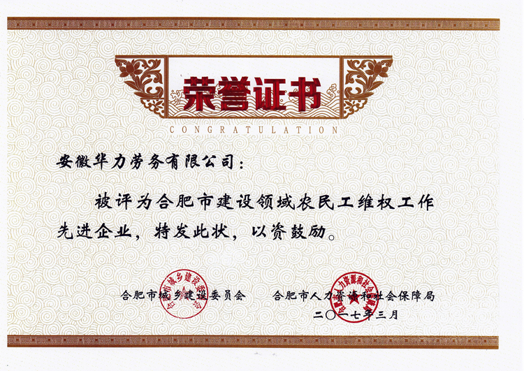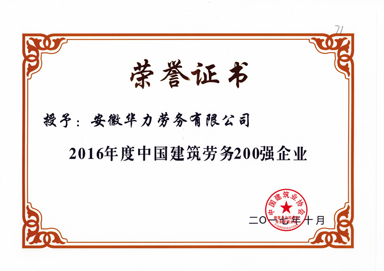 在企業發展的歷程中,認真履行職責,在行業內發揮了先進示范作用。配合相關項目多次創建省、市安全文明示范工地,勞務分包工程也多次榮獲安徽省工程質量獎“黃山杯”,其中分包的安徽電力科研設計大樓工程,被國家建設部評為工程質量最高獎“魯班獎”。華力勞務公司先后被省市主管單位和行業協會評為“勞務先進企業”、“勞務輸出先進單位”、“安全文明管理先進單位”、“安徽省優秀建筑業企業”、“安徽省建筑業外向骨干企業”,被上級公司授予和評為“先進單位”、安全文明和維穩“先進單位”、“先進黨總支”等稱號,并連續三年被中國建筑業協會評為“全國優秀建筑勞務企業”。