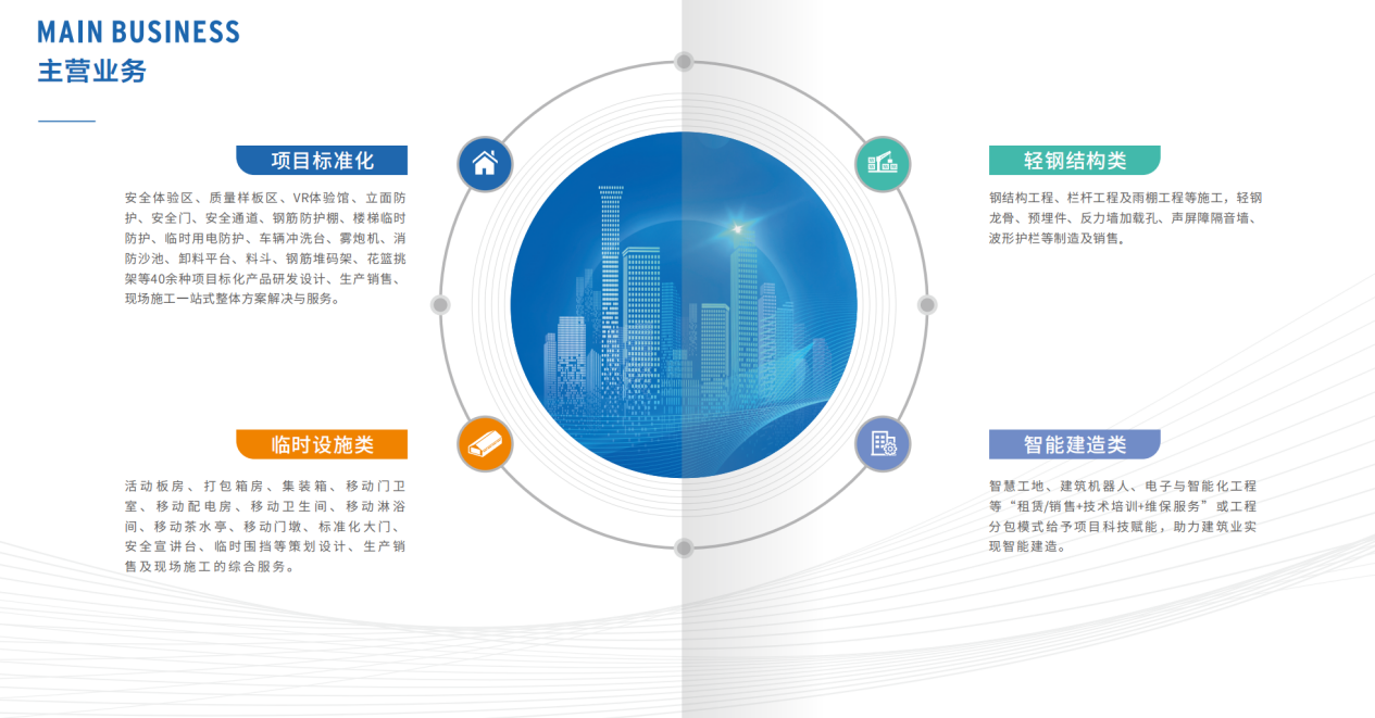 公司主營業(yè)務(wù)涵蓋項(xiàng)目標(biāo)準(zhǔn)化、臨時設(shè)施類、輕鋼結(jié)構(gòu)類、智能建造類等四大板塊,是“安徽省行業(yè)龍頭企業(yè)”、“安徽省著名品牌”、“安徽省安裝和機(jī)械設(shè)備協(xié)會理事單位”、“安徽省鋼結(jié)構(gòu)協(xié)會理事單位”、“3.15安徽省質(zhì)量誠信承諾單位”等。
