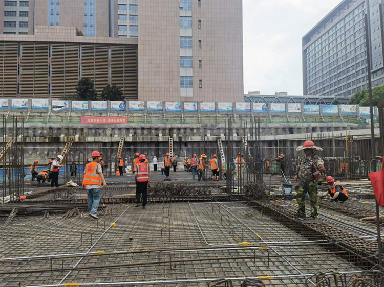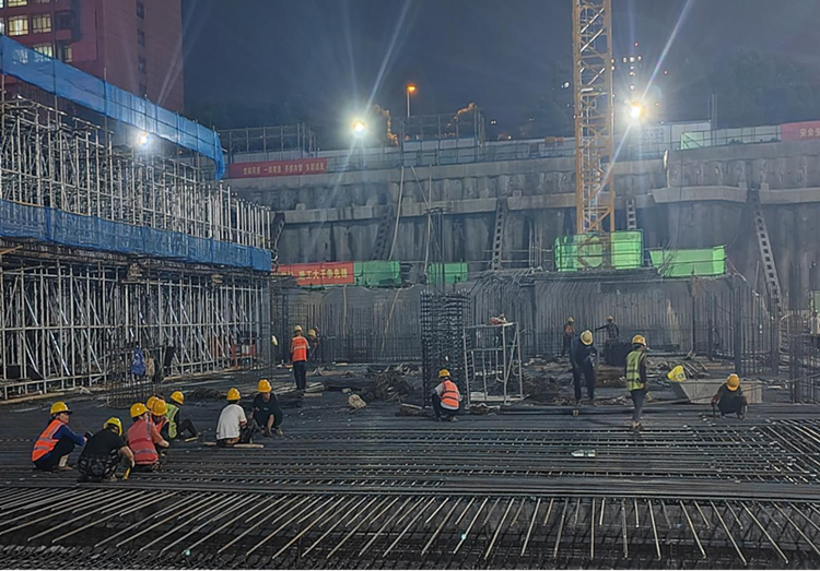 項目地理位置特殊,施工場地狹小,加之前期受土方外運及中高考影響,為項目施工造成諸多困難。為確保施工進度,項目部增加了資源投入,全員采取“5+2、白+黑,陰雨天不停歇”的科學高效輪轉的工作方式,凝心聚力,克服困難,全身心投入到施工現場,確保現場各施工節點可控。同時針對項目三層地下室及型鋼混凝土結構施工難度大、構造復雜的特點,項目部制定趕工措施,合理安排工序,并做好材料的供應保障,塔吊24小時連續作業,科學利用有限時間,堅決打好基礎建設攻堅戰。