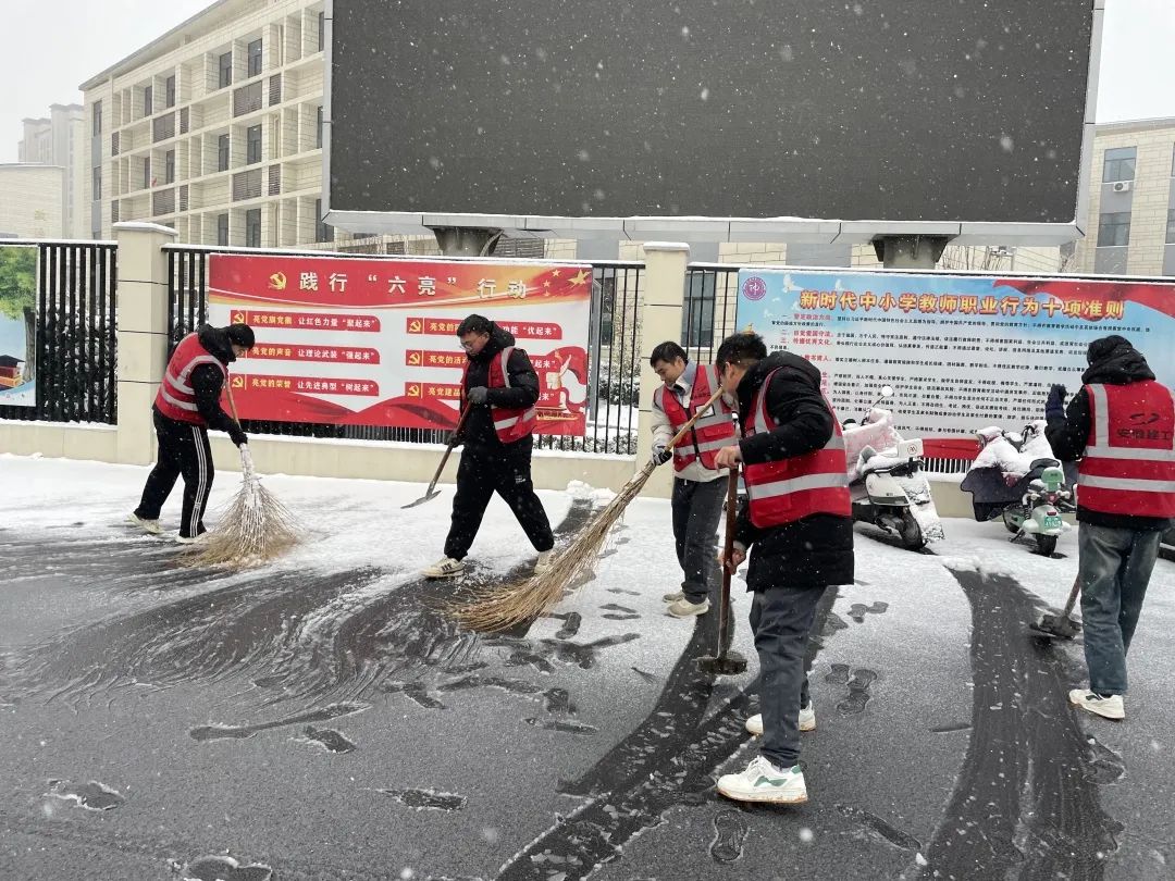 濱湖科學城BK202108地塊項目組織管理人員成立黨員突擊隊、青年突擊隊,前往合肥師范附屬小學周邊林芝路段及佛曉路段開展“掃雪除冰保安全”活動,確保了師生安全出入校園。