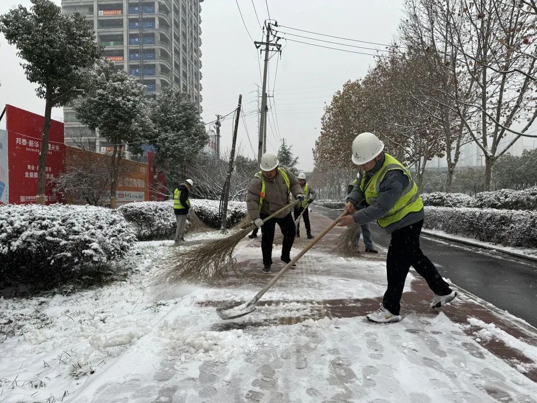 邦泰新華星耀未來項目全體管理人員對紫云路與宿松路交叉口,周崗公交站附近路段開展了積雪大清掃活動,保障了項目施工安全及進度,方便構件車輛與工人安全進出現場。