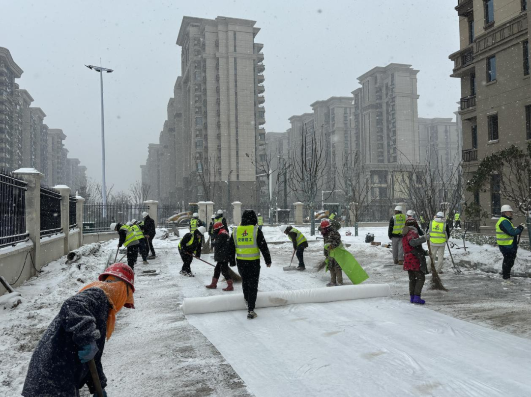 濟南君悅府項目組織全體管理人員共20人對辦公區、施工現場主要道路、車庫頂板等進行除雪,并在雨雪到來之前提前采用密布網對即將澆筑的工作面進行全面覆蓋。全體管理人員團結一致、熱情高漲,保證了項目安全生產的持續進行。