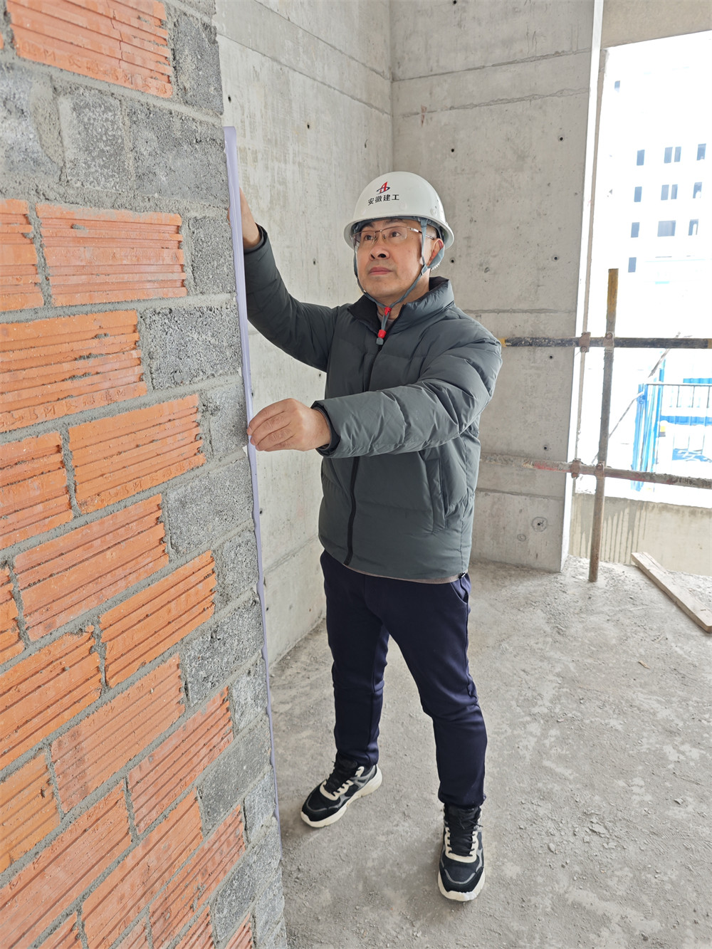 “項(xiàng)目全體職工加班加點(diǎn)奮斗在一線,保進(jìn)度保質(zhì)量,就是為了給業(yè)主們一個滿意的答復(fù)。”技術(shù)負(fù)責(zé)虞玉東正在檢查煤矸石砌體馬牙槎的尺寸及砌體磚縫厚度。