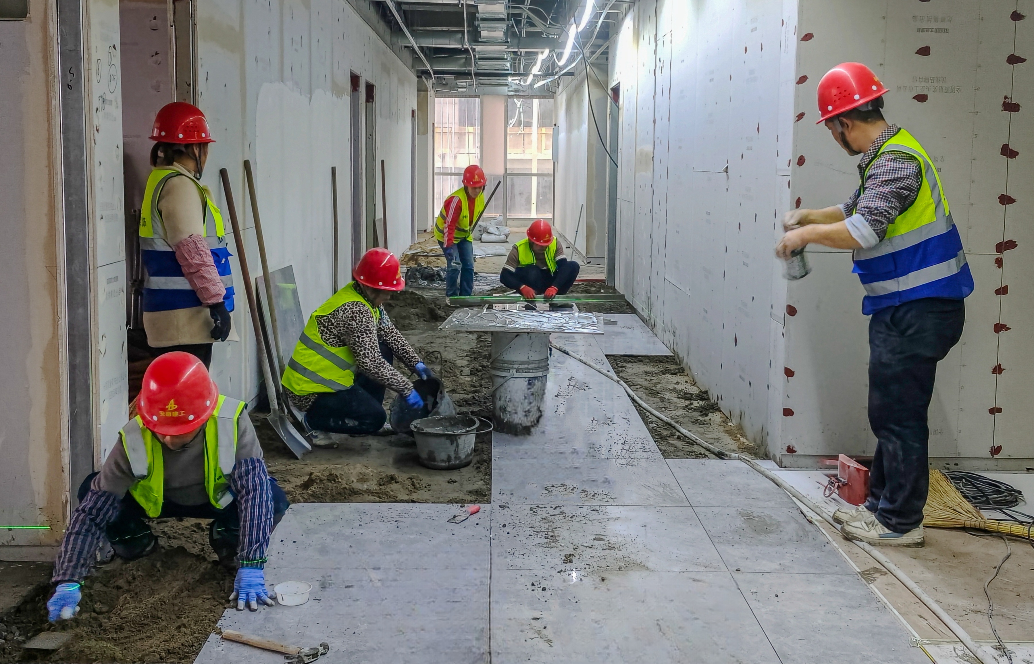 ②1-3層新建隔墻已完成,衛(wèi)生間防水施工完成70%,安裝預(yù)埋完成95%,裝飾基層已完成70%,4層及以上地坪澆筑完成97%,4層以上輕質(zhì)隔墻完成95%,大宗基層材料倒運(yùn)上樓完成95%,地磚鋪貼完成45%,墻面一遍膩?zhàn)优瓮瓿?0%,頂面絲桿打眼布設(shè)完成40%。