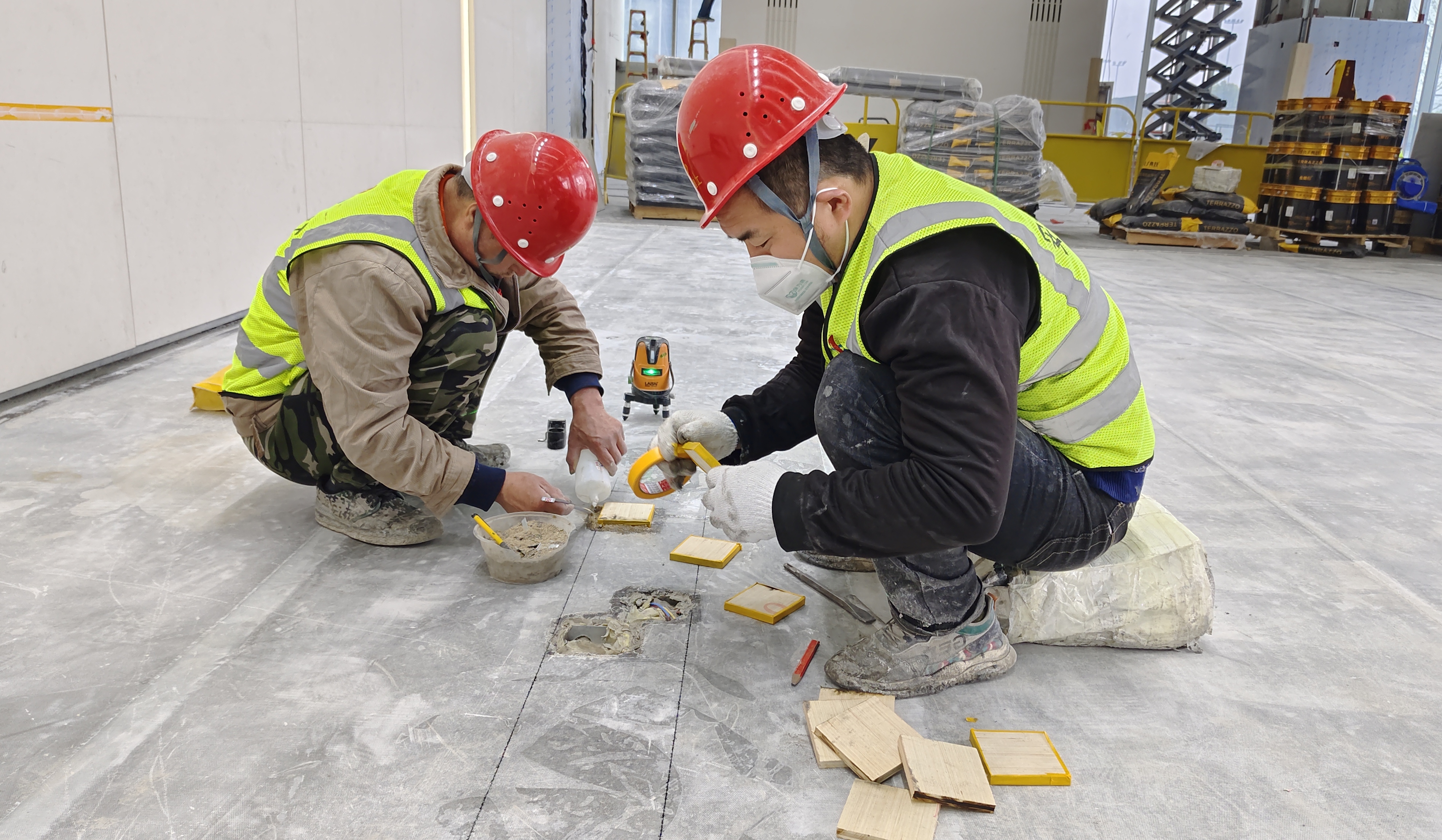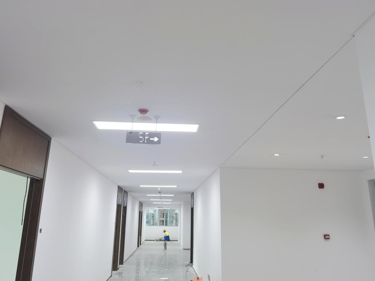 ②樓層裝飾裝修及安裝施工:輕質隔墻已全部完成,頂面封板完成,頂面安裝工程已完成95%,正在進行機電、空調、智能化等收尾工作;墻面裝飾基層已完成,墻頂面飾面板安裝完成45%,木門安裝完成60%,核心筒外圍以及樓梯間地磚鋪貼完成,衛生間防水已完成,衛生間地磚鋪貼已完成,衛生間墻磚已完成,電梯廳墻磚已完成,自流平完成95%,石塑地板安裝完成30%。