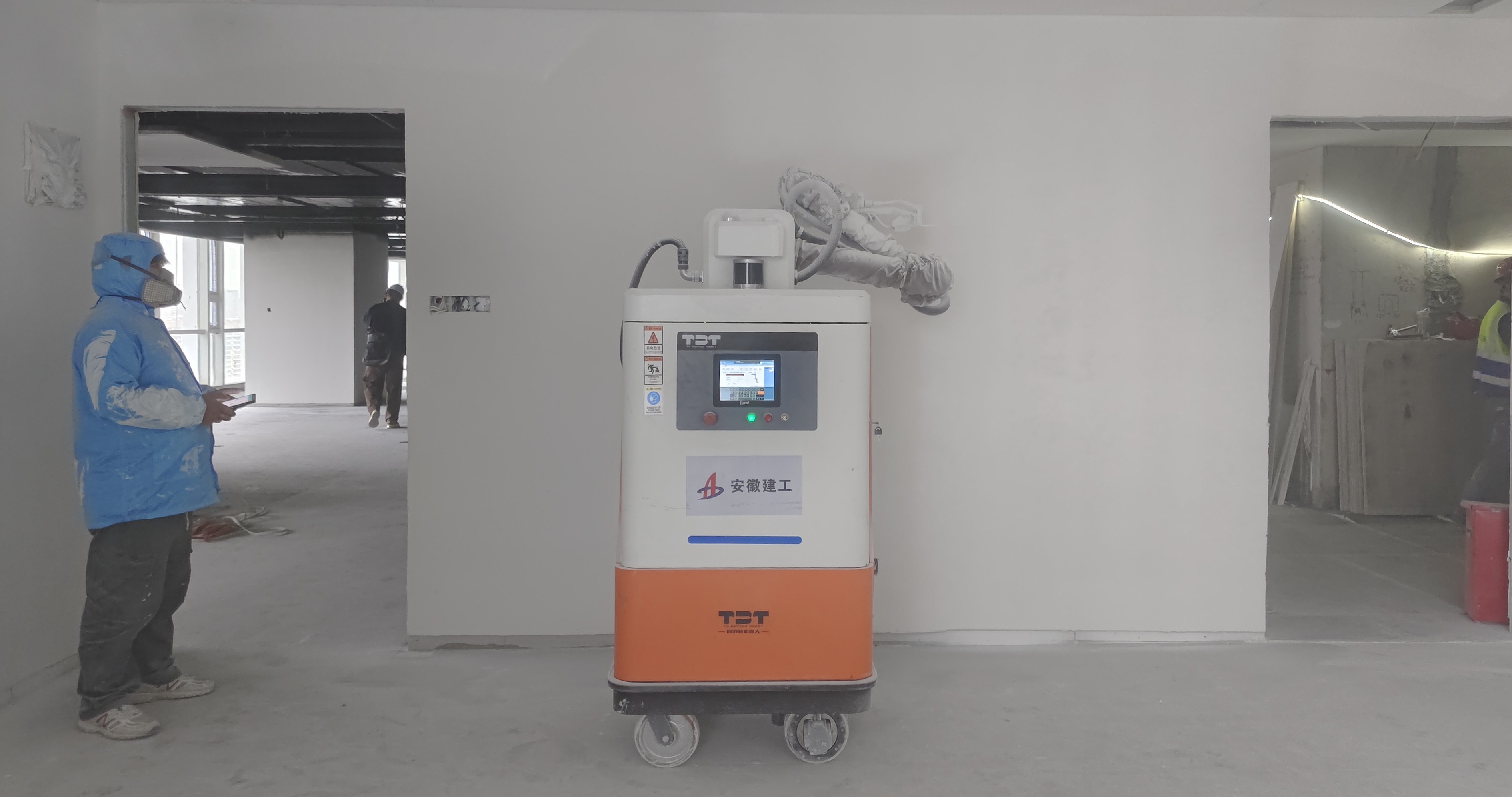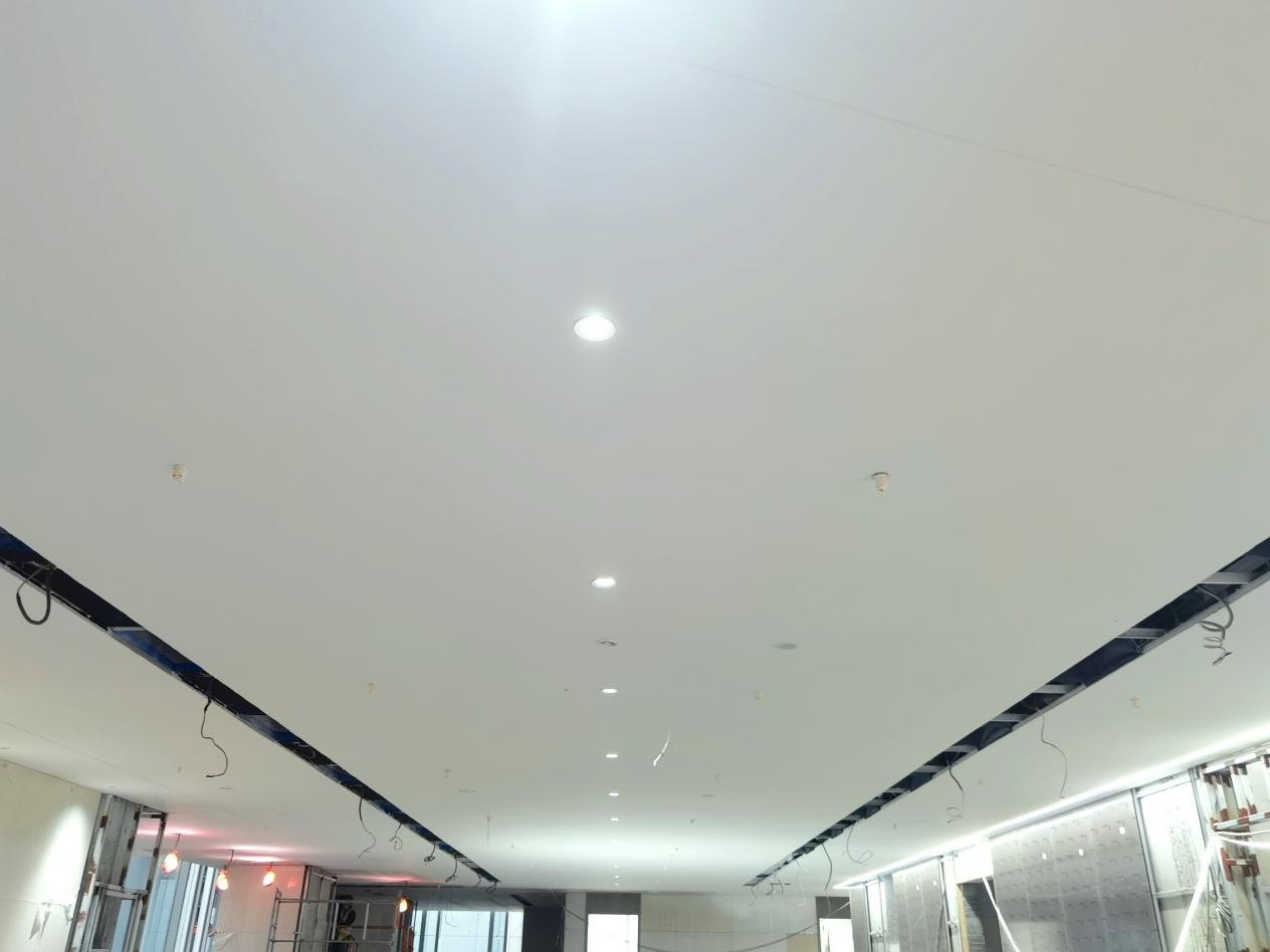 在最后沖刺階段,項目團隊引入噴涂機器人參與室內噴涂作業,制定人機協同施工管理方案,針對室內墻面、天花板等噴涂難點,充分發揮機器人作業噴點均勻、壓力穩定、節省耗漆量等優勢,同時智能無人操作避免了高空作業危險,縮短了工期,極大地提升了噴涂作業施工效率與質量,為項目的圓滿完成提供了堅實的技術保障。