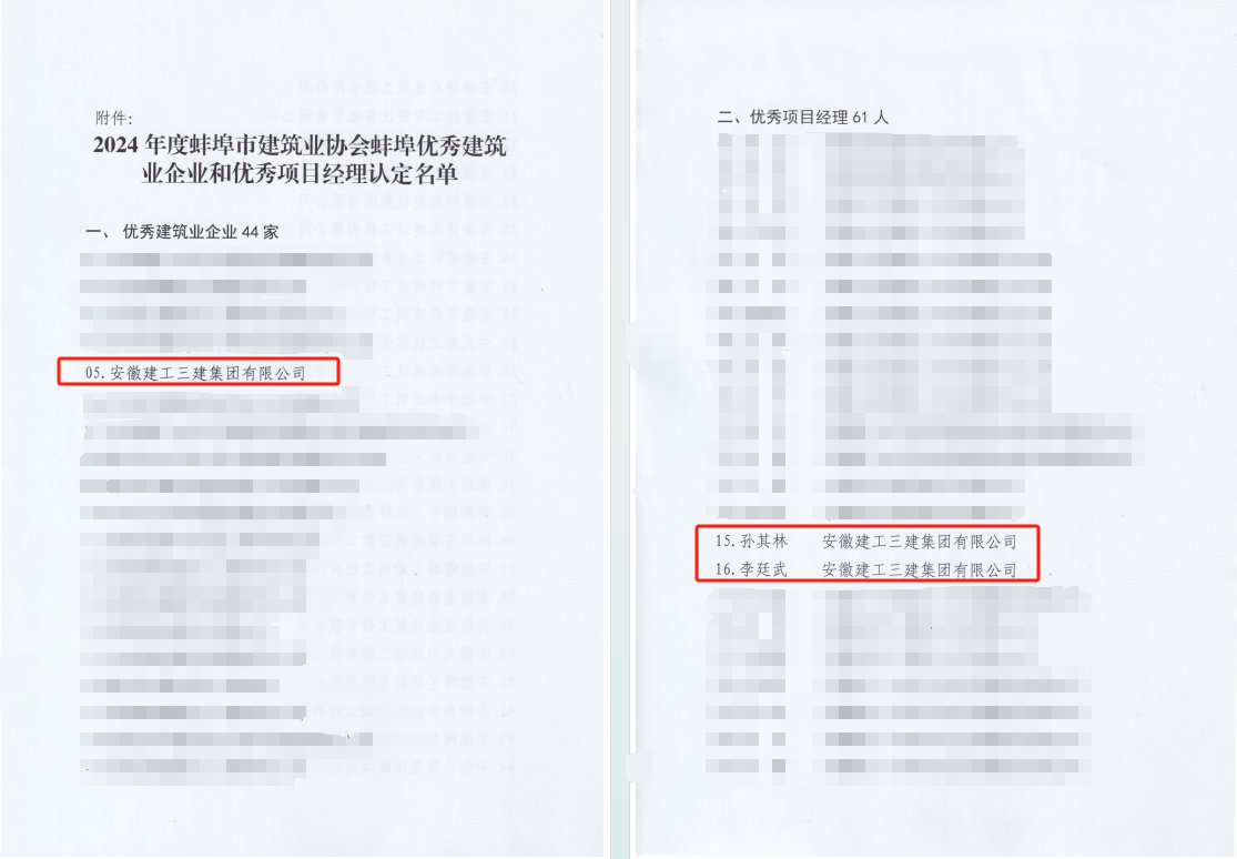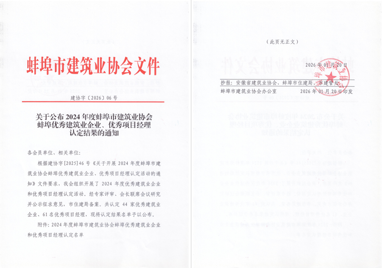 近日,蚌埠市建筑業(yè)協(xié)會(huì)公布2024年度行業(yè)評(píng)優(yōu)結(jié)果,公司再度榮膺“蚌埠市優(yōu)秀建筑業(yè)企業(yè)”稱號(hào),這也是公司連續(xù)三年獲得該項(xiàng)殊榮。同時(shí),公司職工孫其林、李廷武獲評(píng)蚌埠市優(yōu)秀項(xiàng)目經(jīng)理稱號(hào)。