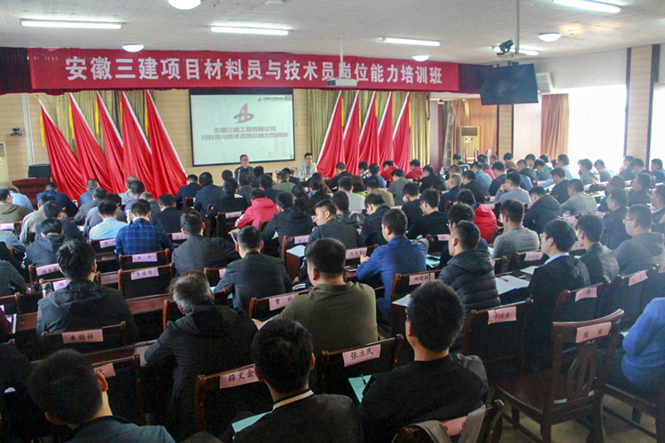 10月17日-18日,為加快推進企業專業崗位技術人才隊伍建設,適應企業轉型發展需要,增加崗位技能培訓的針對性和實效性,安徽三建培訓大講堂第四期——材料員與技術員崗位技能培訓班在公司五樓會議室開班。公司黨委委員、副總經理張斌出席開班典禮,并為來自所屬單位的176名材料員與技術員講授建筑工程項目材料管理的重要性。