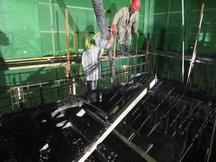 七公司天長恒大湖山半島三標段項目、中海江北G06地塊一標段兩項目:五一期間,約400位一線職工集體加班搶進度,澆筑混凝土、綁扎鋼筋,澆筑防水保護層。