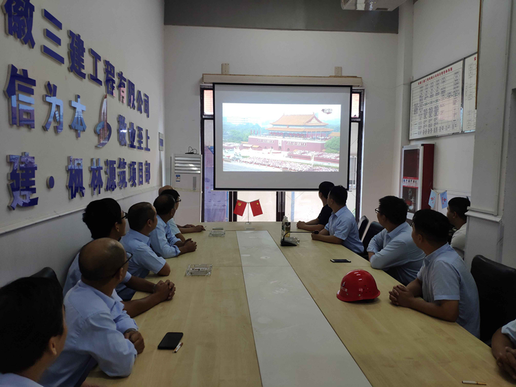 據了解,國慶期間,安徽三建近百個工程項目部,因施工需要無法休假。公司各項目部,就地就近組織收看國慶直播,讓全體員工分享祖國榮光時刻,見證祖國的偉大發展成就,共同慶祝中華人民共和國成立70周年。