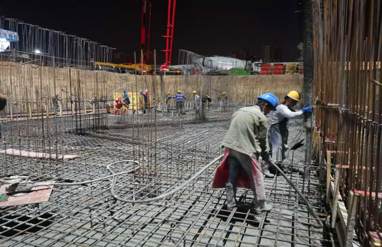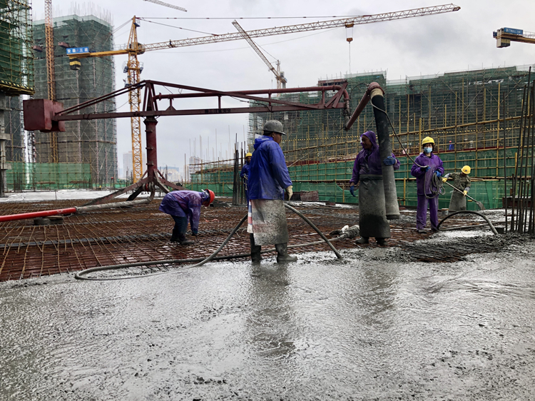 “五一”假期期間,一公司五省八地各項目搶抓黃金施工期,加大機械、人員投入力度,在保證工程質量的前提下,加快施工進度。圖為一公司北海吾悅廣場項目五一期間澆筑混凝土。