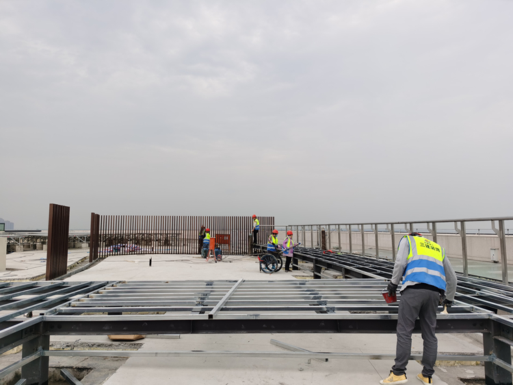 受新冠疫情影響,裝飾公司各項目復工節點比計劃稍有滯后,為了追回進度,五一小假期間,各在建項目不停工,管理人員依然堅守崗位,加班加點利用晴好天氣搶回工期。圖為裝飾公司安徽創新館2號館觀景平臺施工。