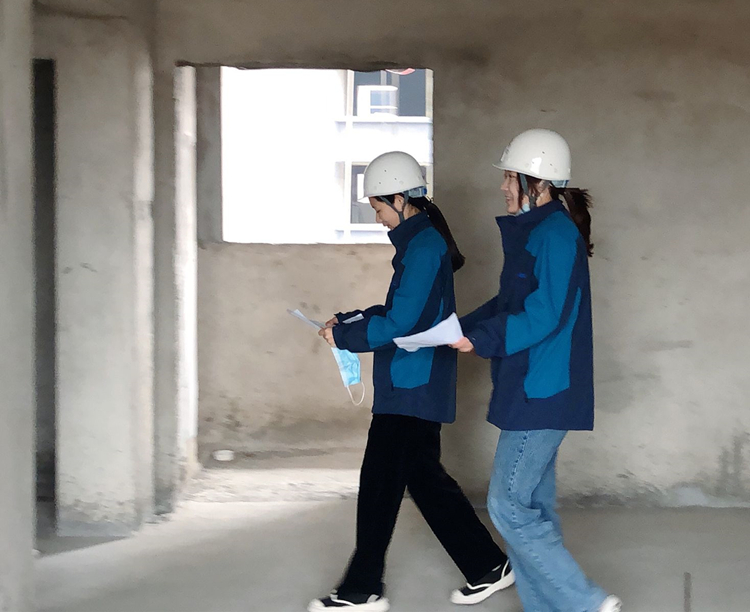 八公司臨泉銀杏苑項目資料員程妙錚、陸晴復核現場標高、開間、凈高