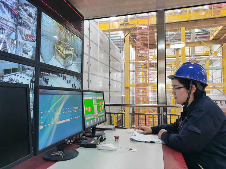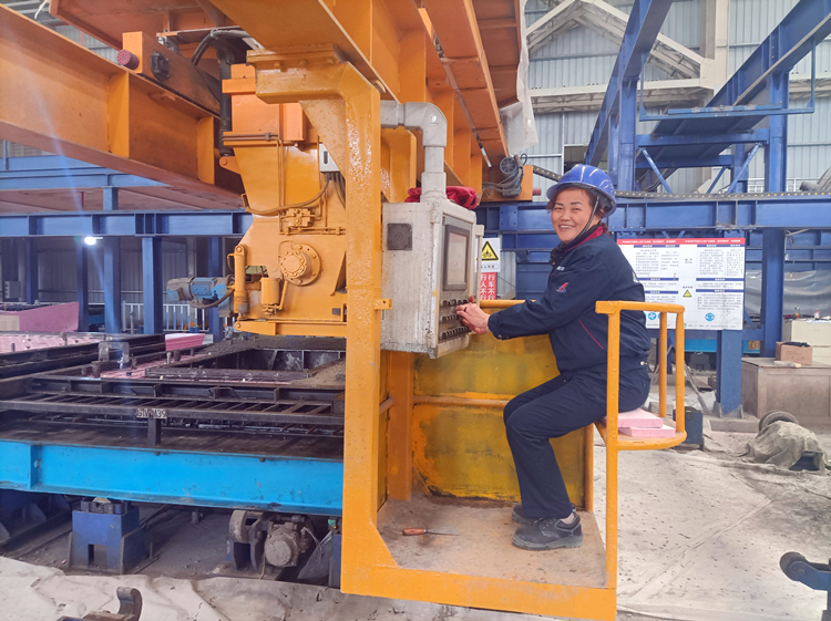 北城工業公司養護窯中央控制室操作員黃霜正在使用碼垛車進行構件存取操作