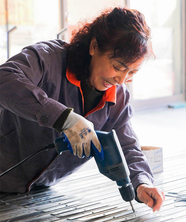 門窗公司女工王來菊在車間工作區域進行材料加工工作,搶門窗生產進度