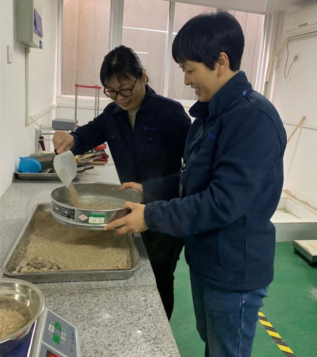 工程研究院實驗室職工袁家敏與楊珣正在集料室做砂子篩分析試驗